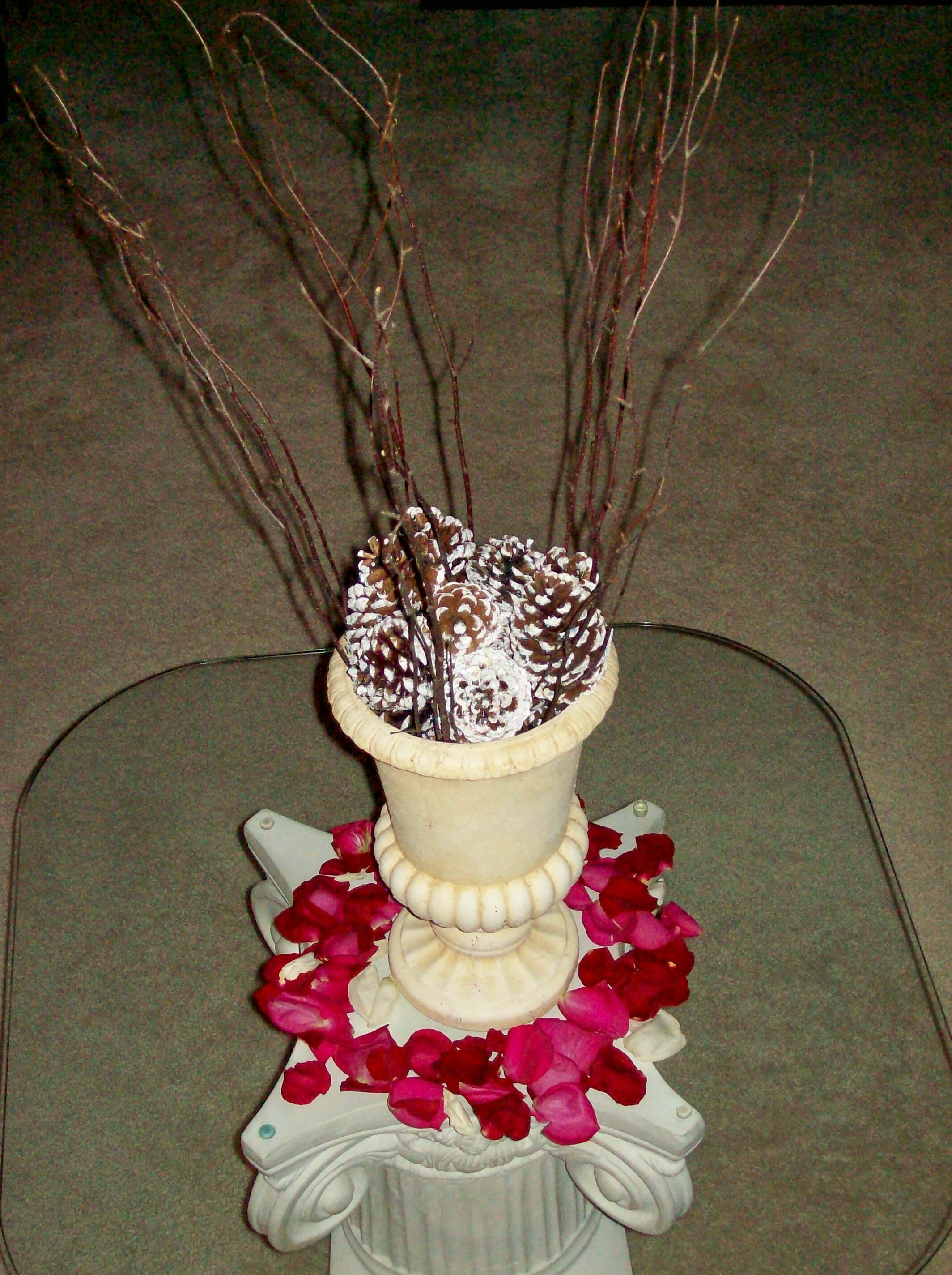 Classic ceramic urn filled with winterized pine cones decoratively punctuated with birch branches and circlet of multi-hued, fresh rose petals around the urn base for that special romantic flair!